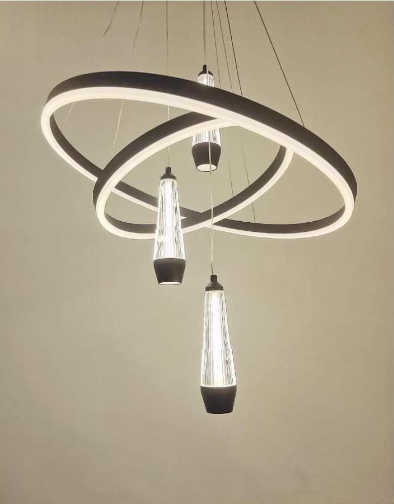 تصميم ثلاثي عصري متدلٍ من السقف، يجمع بين خامة المعدن المتين والمظهر المتناسق، ويعمل بثلاث لمبات LED مدمجة توفّر إنارة بثلاثة ألوان مختلفة (صفراء، بيضاء، شمسي) لتناسب كل وقت ومزاج.
