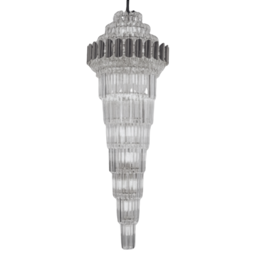 - ان التصميم الجميل والمعقد لهذه الثريا يجعلها مثالية للتزيين وتحسين ديكور المكان، فهي تزخر بالكثير من التفاصيل الانيقة. وتتميز بتصميم انسيابي يجعل من الضوء ينعكس بشكل مثالي على سطحها الزجاجي الشفاف، حيث تضيء المكان بشكل رائع
